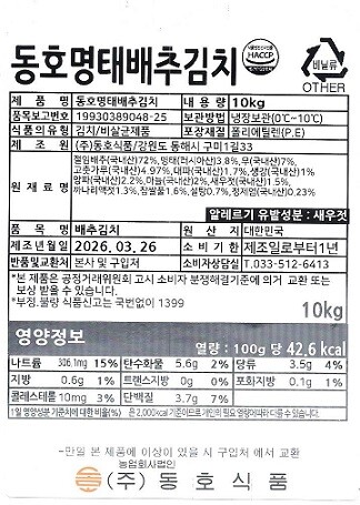 | 원재료명 및 함량 | 절임배추(국내산)72%,무(국내산)7%,고춧가루(국내산)4.97%,마늘(국내산)2%,생강(국내산)1%,명태(러시아산)3.8%,양파(국내산)2.2%,대파(국내산)1.7%,새우젓(국내산)1.5%,정제염(국내산)0.23%,까나리액젓1.3%,찰쌀풀1.6%,설탕0.7% * 알레르기를 일으킬 수 있습니다.(새우젓) |